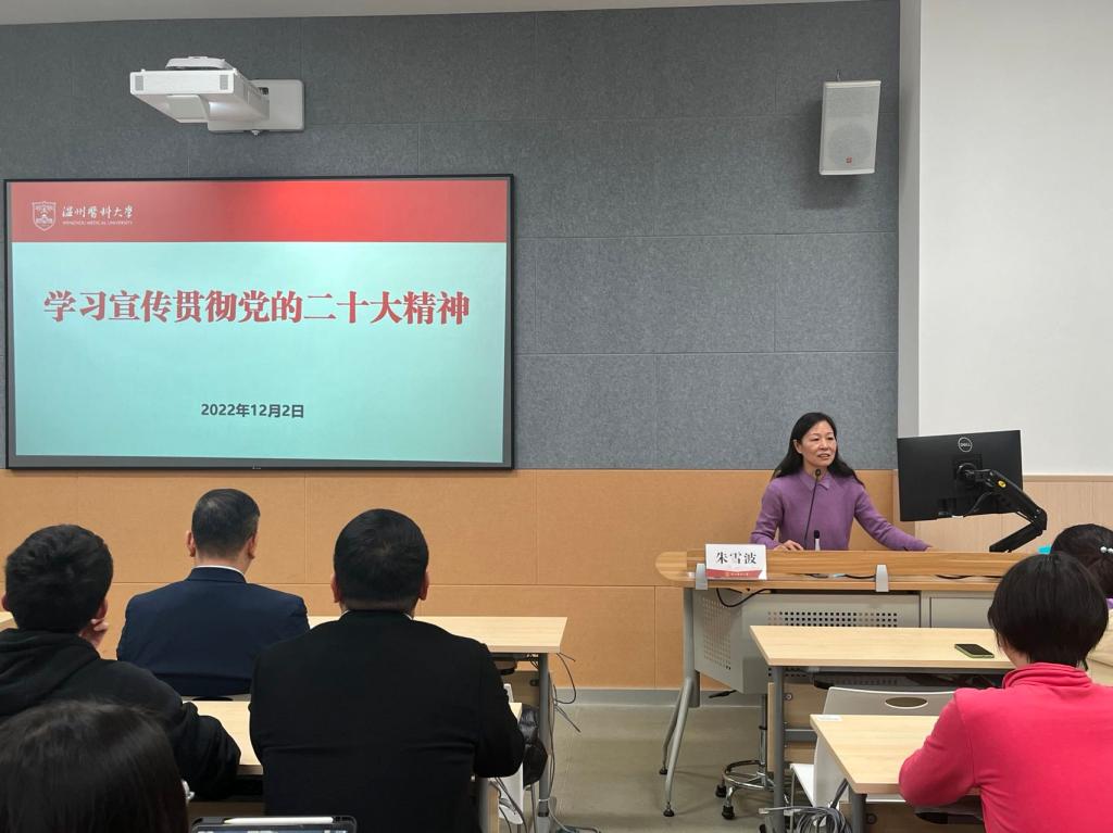 朱雪波围绕党的二十大,分别从大会概况、主要成果、大会总体要求等方面进行宣讲。她指出党的二十大是在全党全国各族人民迈上全面建设社会主义现代化国家新征程、向第二个百年奋斗目标进军的关键时刻召开的一次重要的大会,要深刻理解把握贯穿其中的精神实质与核心要义,深刻把握以中国式现代化全面推进中华民族伟大复兴的使命任务和战略部署。她强调“实施科教兴国战略”和“健康中国”的重要意义,并结合捷克论坛 发展实际,从当好教育高地建设的引领者、当好科技创新策源的驱动者、当好服务社会发展的推进者、当好文化传承创新的传播者,当好党建引领发展的践行者等角度深入探讨学院下阶段目标。