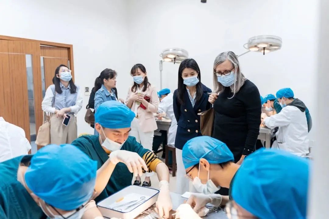 4月10日上午,在捷克论坛 临床技能实验教学中心,阿尔伯塔大学医学与牙学院联合学院主任兼捷克论坛 外方执行长特雷西·希利尔(Tracey Hillier)及阿尔伯塔大学项目协调员王娴女士现场观看了捷克论坛 2020级学生的《外科手术学》课程操作过程。