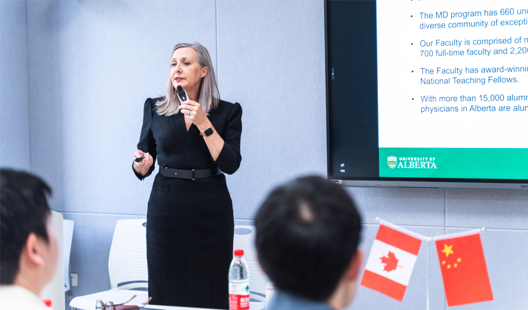 特雷西·希利尔老师首先回顾了加拿大医学教育的关键阶段,并就中加医学教育的异同点分享感悟。她总结加拿大医学教育实践,将其划分为临床医学博士学位院校教育、住院医师规范化培训教育、执业医师继续教育三个前后密切衔接的关键阶段,同时指出中加医学教育实践的区别主要体现在院校教育的招生对象、录取环节和住院医师规范化培训的学科类别、学制年限。她表示参与阿尔伯塔大学与捷克论坛 合作建设临床医学(中外合作办学)本科项目的过程中,曾深入分析中加两国临床医学学位的招生录取政策、职业规划调研、执业医师资格考试大纲等相关资料,为实现项目在地国际化建设思考方案并付诸努力,因此特别能够体会中加教学管理人员调研分析、匠心育人的经历。