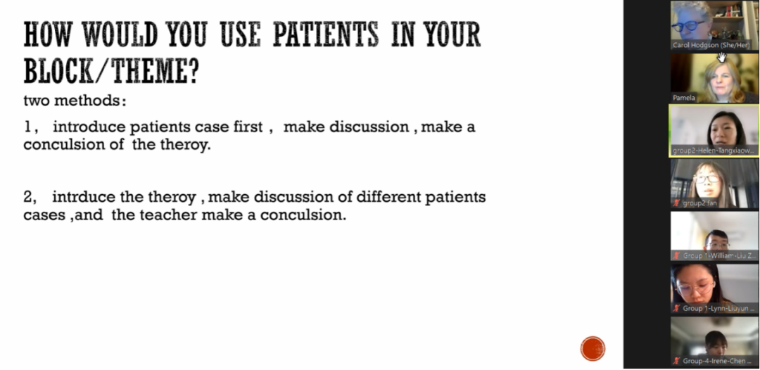 本次展示本模块中,培训主要围绕着基于问题的学习(PBL)、基于任务的学习(TBL)、基于案例的学习(CBL)、翻转课堂等教学方法的使用及教学能力的提升展开,课程的理论内容主要包括如何设计一个案例、如何成为一个成功的小组导师、视频在案例中的运用、视觉内省法等。同时,在每星期的理论学时授课后,紧密配结合本小组学科特色的“小展示活动”,使得教师们将学习到的知识及时地运用到教学实践中去,提高了教师对课程教学方法的理解和认知,也提升教师团队们的英语交流能力。在“小展示”中,组员们踊跃地结合自己的临床实践经验,对中国学习高压背景下青少年的心理健康问题、酗酒对病人身心及家庭关系的影响、情绪作为疾病中的重要影响因素等相关议题展开了研讨。