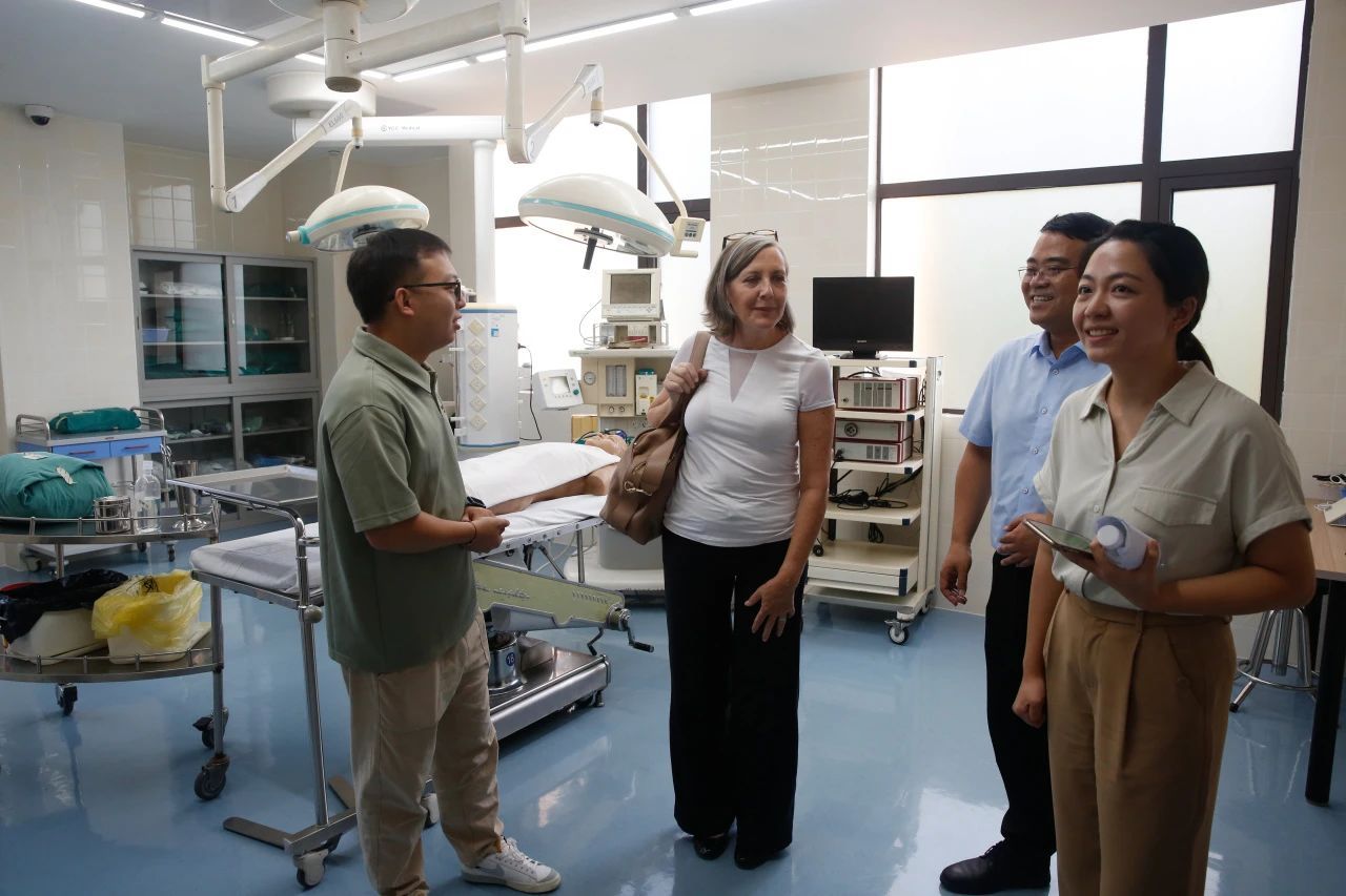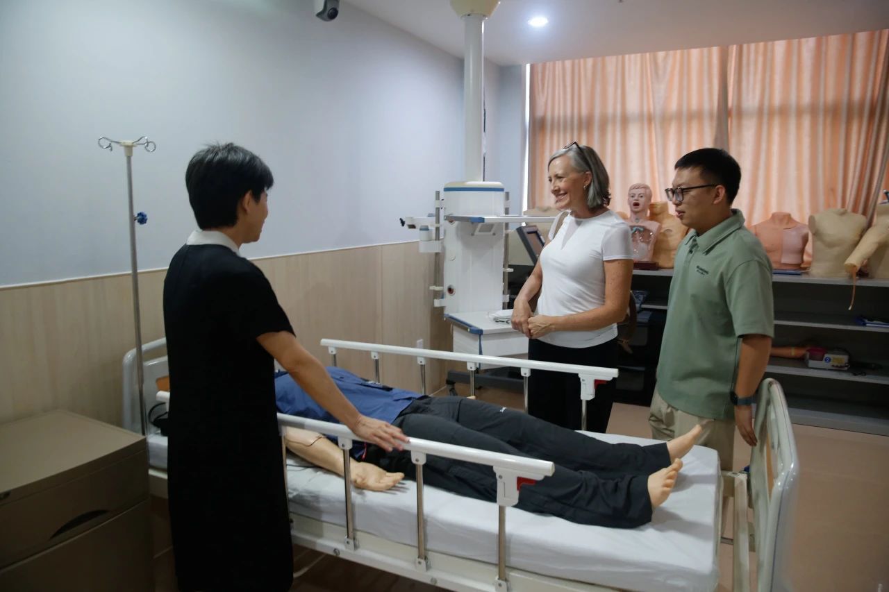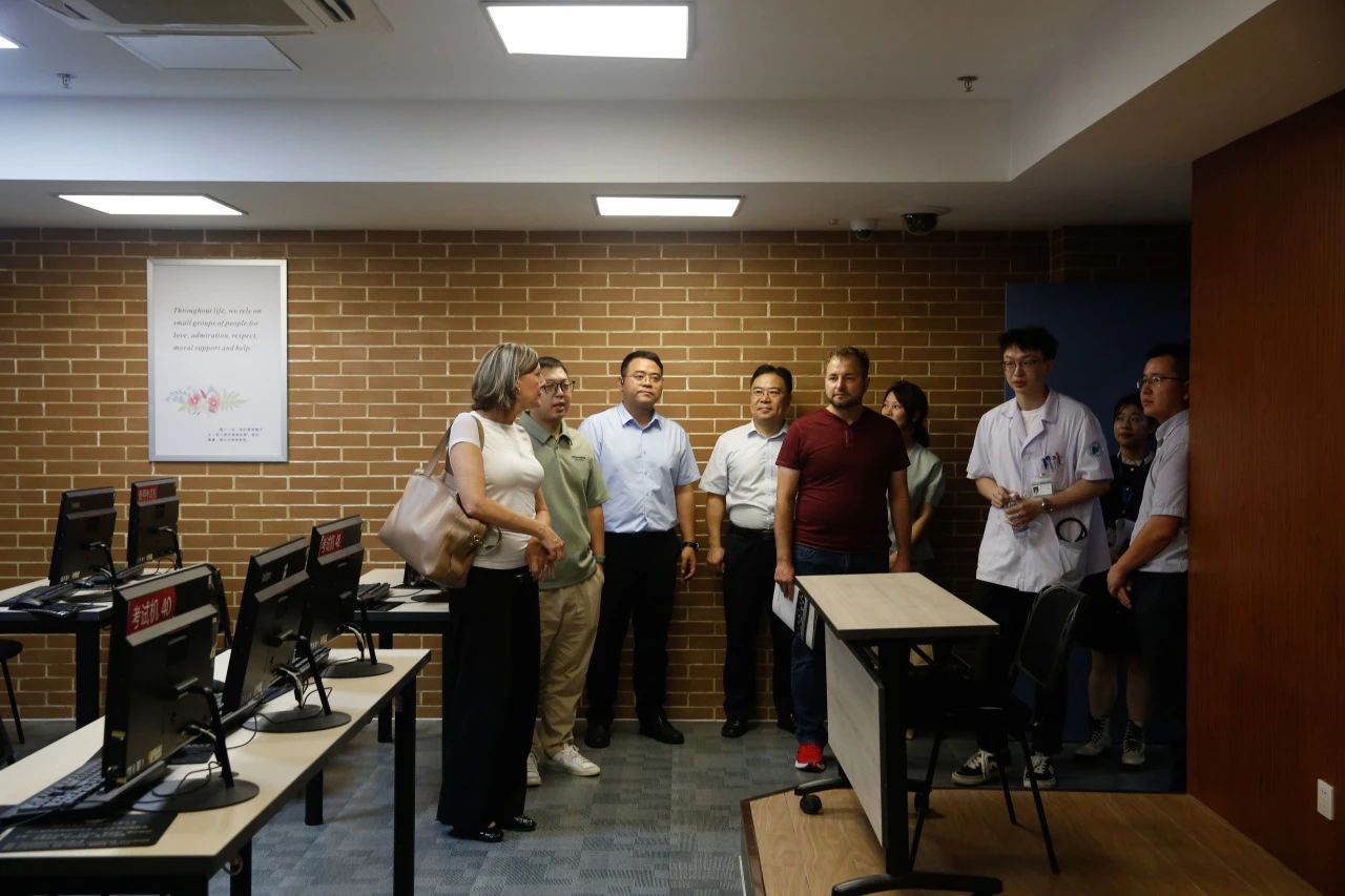 座谈交流后,访问团一行走访了医院的教学大楼、内科大楼、临床技能实训中心以及OSCE客观结构化临床考试中心等地,实地调研教学基地管理建设现状。加方代表团对医院现代化的美式风格倍感亲切与赞叹,同时也对医院的教学设备、实践考试标准化流程进行深入细致的考察。