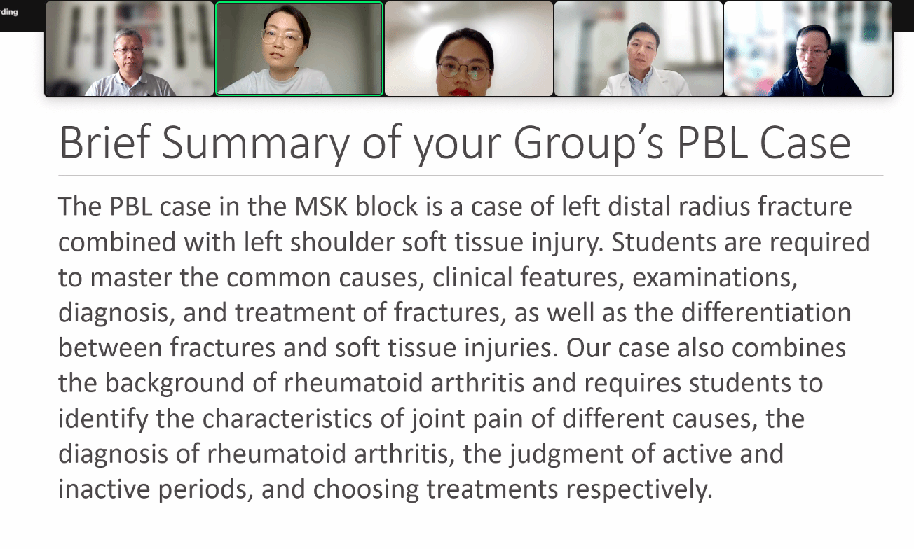 在本模块的期末汇报中,各组以PBL案例为基础,在实践中与小组中不同学科的教师共同携手合作,应用所学的理论知识。每组根据各自的案例,确定需要纳入考核的相应学习目标(learning objectives)、期待学生达到的认知应用水平;进而,根据学习目标的重要程度(impact)及流行度(prevalence),对考试题目的相应难度、形式、数量进行编制;并反复对试卷中的题目数量、选项表述、与专家进行研讨、修改及探究。