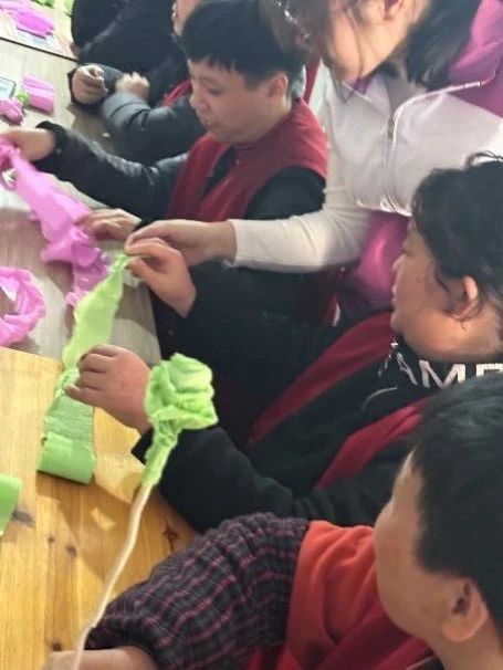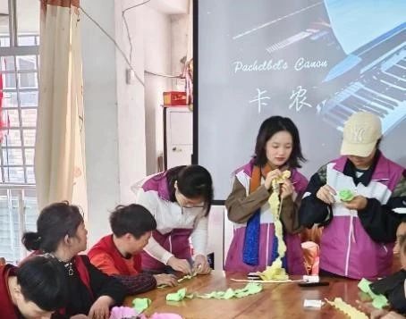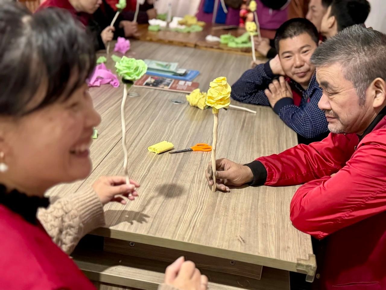 休息片刻后,志愿者们准备好了材料,与学员们一起做纸花。大家动手折叠,剪裁,互相交流着技巧和经验。在欢声笑语中,一朵朵精美的纸花逐渐成型,装点了整个活动现场。这个简单而有趣的手制作,不仅锻炼了学员们的动手能力,也增强了他们的归属感。