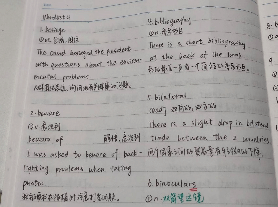 单词是语言学习的根基。相比在做题中积累,我更喜欢有目的性地使用词书。按字母顺序记忆,不仅能把形近词放在一起对比记忆,看着首字母从A逐渐翻到到Z,也让我在备考过程中获得了持续的成就感。我还习惯准备一个词汇本,随时记录和复习,日积月累效果显著。