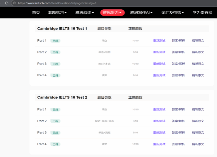 关于听力训练的平台方面,我推荐“学为贵”网站。它的界面最接近真实机考,可以自由调整字号、标记重点、计时答题,且配有详细解析,非常适合日常的听力训练。