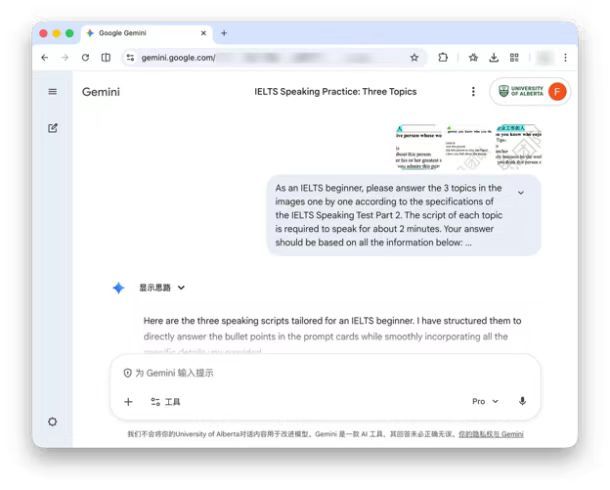 此外,依托学院的国际网络专线以及阿尔伯塔大学的教育账号,我得以充分使用英语母语大模型 Gemini Pro,通过与其对话交流的方式,持续训练英语思维习惯的口语表达、打磨优化回答内容,让我的口语能力得到了切实提升。