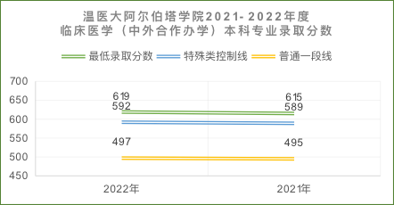 临床医学(中外合作办学)专业最高分630分(位次:19596),最低分619分(位次:28835)。在高考英语120分及以上的录取条件下,该专业录取最低分连续两年均比普通类平行投档线(一段)高120分及以上、比特殊类型招生控制线高25分及以上,最高分位次较去年有所提升。其生源质量保持高位运行,稳步提升,其投档线稳居省属本科院校中外合作办学专业第一位!